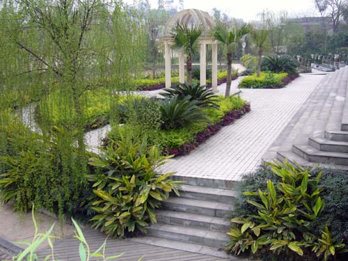 a.神道:长150米,宽15米,按古代“数论”的大阳之数设计,整体分为9段共369阶。神道为陵园中轴线上重要构筑,亦是连接大门、广场到山顶的主要通道。神道上将建造三道天门,即一天门、中天门、西天门,充分显示陵园恢宏气势和敬天祭祖功能。神道两侧为十五米宽的花园,栽种四时花卉。