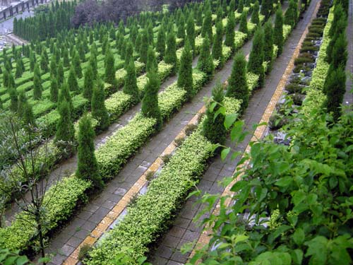 地墓区:位于中轴线两翼,万年神龟龟背,沿中轴线和龟背线,按传统人文的“忠、孝、仁、礼”内涵,分为“忠”、“孝”、“仁”、“礼”四大墓区,每大片区根据地形及道路、绿化、休闲等功能需要分为若干小区。墓区多重绿地,让墓位掩映在绿树丛中,彰显葬乘生气,令人神清气爽。